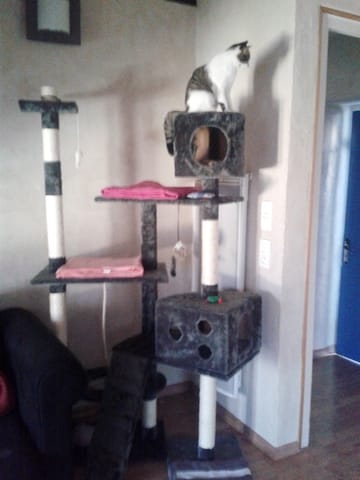 Ah oui c'est pas comme arbre à chats le tien angeline56, nous en voulons un avec pas trop de plate forme et cachette sur le bas pour qu'il soit tranquille quand il en aura marre de la chienne