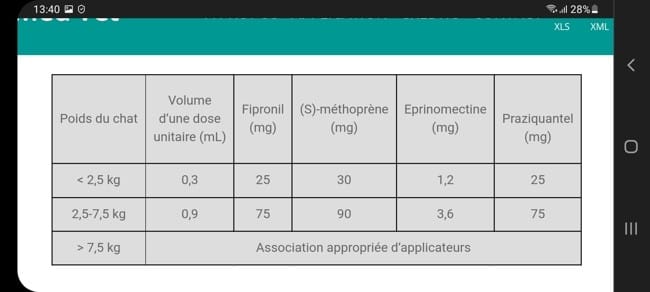 Les doses minimales recommandées sont de 10 mg/kg de poids corporel pour le fipronil, 12 mg/kg pour le (S)-méthoprène, 0,5 mg/kg pour l’éprinomectine et 10 mg/kg pour le praziquantel. Je n'ai pas fais assez attention...😩