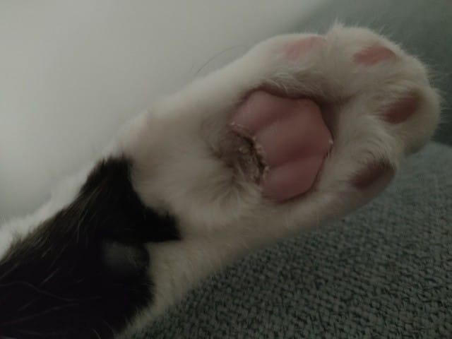 La lésion au niveau du coussinet est difficile à évaluer sur une simple photo avec cet éclairage et l'impossibilité de toucher.