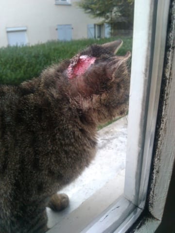 Bonsoir je poste ce message car j'ai un petit soucis avec un chat de mon voisinage , voilà cela fais plusieurs semaines qu'il vient a ma fenêtre pour demander des caresses ou autre du coup moi et moi et mon compagnon lui donnons a manger et a boire mais cela fais une semaine qu'il est blesse au niveau de la tête j'ai essayer de le désinfecter mais rien n'y fais malheureusement je ne peux le reprendre mon fils et mon compagnon étant allergique , je ne sais pas quoi faire et cela me rend triste de le voir dans cet état . je vous poste la photo pour que vous m'aidiez a déterminer ce que peut être cette blessure . merci
