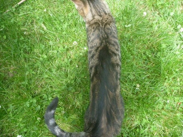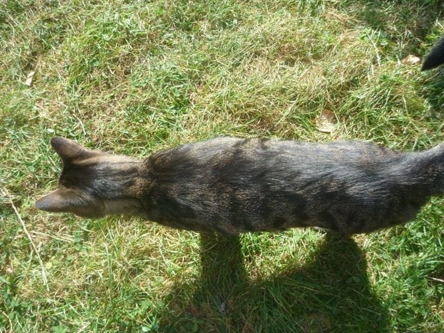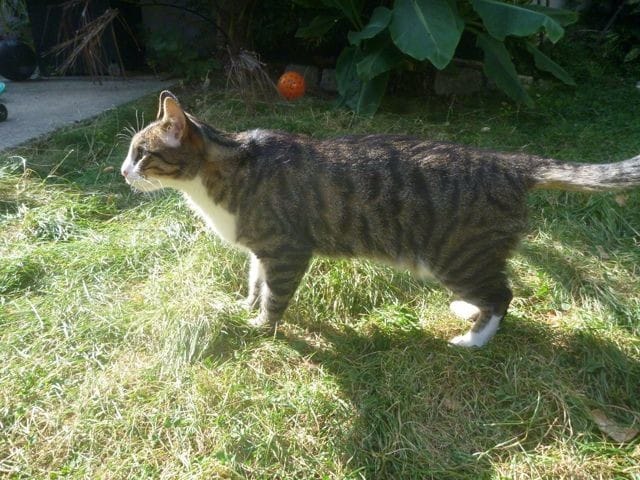 19 août : je suis revenue de vacances. D'après la personne tout s'est très bien passé. J'ai remarqué que Taïko avait grossi, je l'ai pesé et là : 5,6kg au lieu de 4,7kg ! Il a pris presque un kilo ! Il est clairement en surpoids mais, étonnamment, il n'est pas obèse et court, saute, joue aussi bien qu'avant. Je peux palper ses côtes sans trop de problème, peut-être un peu plus difficilement qu'avant. J'ai commencé à introduire progressivement des courgettes dans sa pâtée pour essayer de le faire maigrir car je n'ai pas envie de rationner Taïko et de refaire la même erreur.
