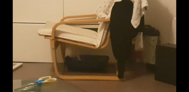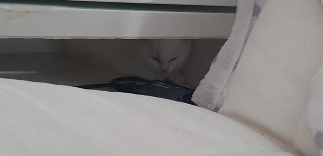 A un moment, je ne le trouvais plus et il ne faisait plus de bruit. J'ai donc sorti la vidéo de ses Miaulements. Il y a de suite répondu et ai sorti de sa cachette (derrière mon lit).