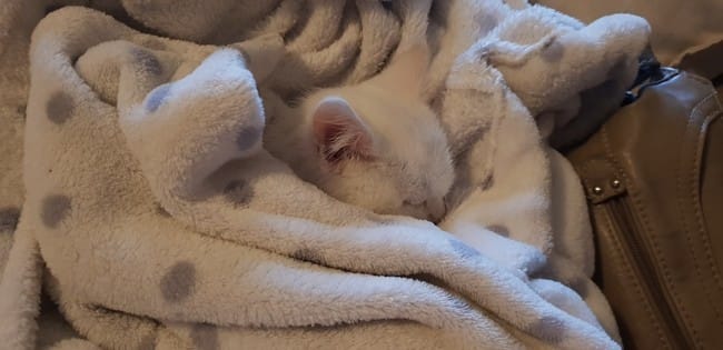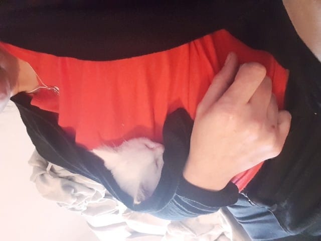 Finalement, 2h après son arrivée, toujours miaulant, je l'ai contre moi, blotti contre mon ventre et couvert de mon gilet, il s est endormi pendant 1h.