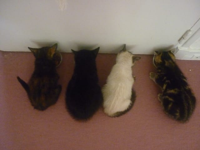 Sur cette photo ce sont les bébé de Callie, l'écaille faisait environ 700 grammes, le noir 900 grammes, la seal point 600grammes et le tigré plus d'1 kilo ! Et ils avaient environ deux mois et de la même portée.