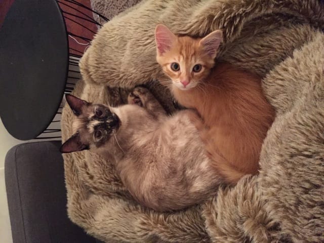 Je vous rappelle que Pêche est une femelle de type siamoise de 10 mois, habitue aux chiens mais qui n'a plus vu de chat depuis longtemps..