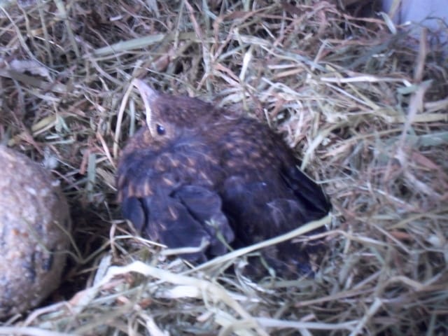 J'ai réussi à lui enlever avant qu'elle ne le tue et le dévore. Ma mère et moi l'avons installé dans une cage de transport garnie de foin. Nous pensons qu'il s'agit d'un merle femelle qui a dut tomber du nid.