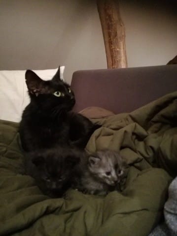 Ma chatte va mettre bas , on ne s'attendait pas à ce quelle choisisse un endroit aussi dangeureux , on ne peut ni laider en cas de soucis ni déplacer les petits après, et elle veut absolument qu'on reste avec elle ..