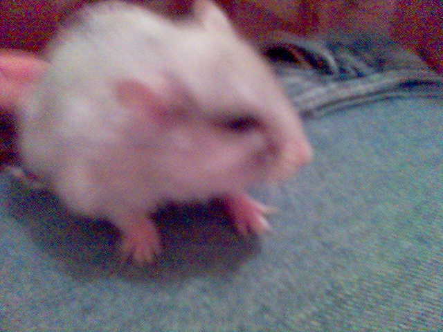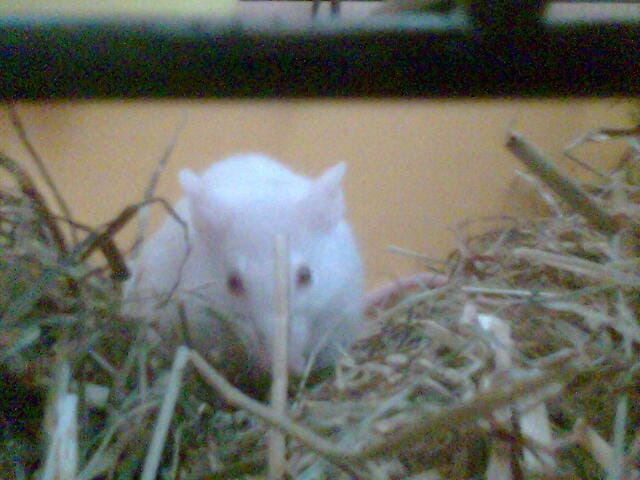 souris, une ancienne souris d'expérience de mon prof d'svt, il s'en servait pour toutes sorte d'expérience et vivait dans un mini cage avec seulement un tissu et du pain ...