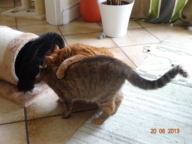 Le seul des 5 qui a mangé sa pâtée ce matin, c'est bien sûr mon ptit goinfre, BB Harley. A part lui personne n'a rien mangé depuis hier après-midi. Bon, une petite diète ne va pas leur faire de mal, ils mangeront quand ils auront super faim, mais ce qui m'inquiète davantage c'est que sauf peut-être Nounouche, personne n'est allé à la litière. Du coup ce matin j'ai mis la grande litière, celle de mes loulous, dans la salle de bain, comme ils ont l'air décidés à vivre au fond de l'appart pour l'instant au moins ils pourront faire leurs besoins. ça ne me plait pas qu'ils se retiennent comme ça. En même temps, vu qu'ils ne boivent ni ne mangent, ce n'est pas très étonnant.