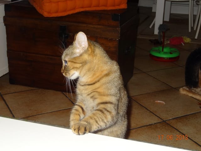 Ce matin Etoile était toujours à la même place sous le meuble TV. Je l'ai sortie pour la câliner et lui parler tout doucement, petit à petit elle s'est détendue, c'est mignon elle cache sa tête dans ma main quand le la câline :). J'ai cru que c'était gagné car après être descendue de mes genoux elle a commencé à marcher avec circonspection sur le tapis et à le flairer, mais d'un coup elle est repartie se cacher, cette fois sous un meuble de cuisine. ça ne va pas être simple pour lui mettre ses gouttes dans les oreilles !