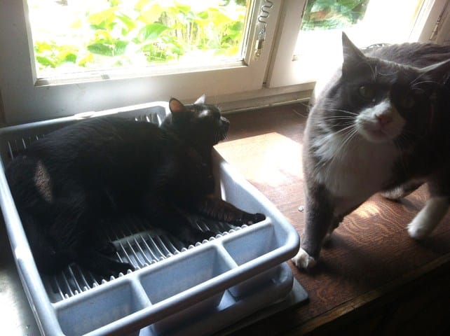 Le seul des 5 qui a mangé sa pâtée ce matin, c'est bien sûr mon ptit goinfre, BB Harley. A part lui personne n'a rien mangé depuis hier après-midi. Bon, une petite diète ne va pas leur faire de mal, ils mangeront quand ils auront super faim, mais ce qui m'inquiète davantage c'est que sauf peut-être Nounouche, personne n'est allé à la litière. Du coup ce matin j'ai mis la grande litière, celle de mes loulous, dans la salle de bain, comme ils ont l'air décidés à vivre au fond de l'appart pour l'instant au moins ils pourront faire leurs besoins. ça ne me plait pas qu'ils se retiennent comme ça. En même temps, vu qu'ils ne boivent ni ne mangent, ce n'est pas très étonnant.