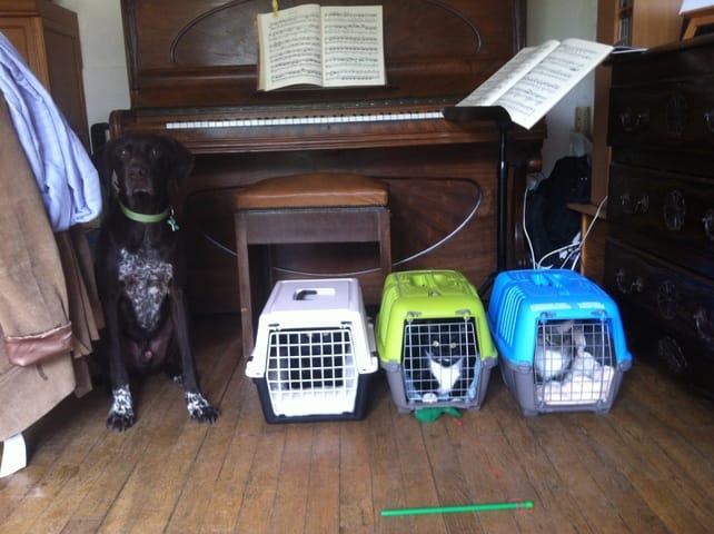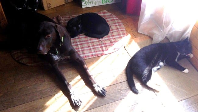 Quand je suis allée me coucher mes loulous sont restés avec moi dans la chambre, mais personne n'a beaucoup dormi ! Chaque fois que je les regardais ils étaient éveillés, Félia en train de monter la garde à l'entrée de la chambre et les deux garçons en alerte aussi. Il faut dire que Nounouche s'est mise à miauler dès mon départ du salon, et n'a dû arrêter que vers 7h00 du mat'... Mais elle n'a pas osé venir dans la chambre, et tant mieux parce qu'à mon avis ça aurait été sportif ;)