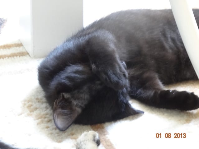 Ce matin Etoile était toujours à la même place sous le meuble TV. Je l'ai sortie pour la câliner et lui parler tout doucement, petit à petit elle s'est détendue, c'est mignon elle cache sa tête dans ma main quand le la câline :). J'ai cru que c'était gagné car après être descendue de mes genoux elle a commencé à marcher avec circonspection sur le tapis et à le flairer, mais d'un coup elle est repartie se cacher, cette fois sous un meuble de cuisine. ça ne va pas être simple pour lui mettre ses gouttes dans les oreilles !