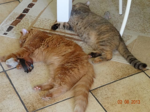 Quand je suis allée me coucher mes loulous sont restés avec moi dans la chambre, mais personne n'a beaucoup dormi ! Chaque fois que je les regardais ils étaient éveillés, Félia en train de monter la garde à l'entrée de la chambre et les deux garçons en alerte aussi. Il faut dire que Nounouche s'est mise à miauler dès mon départ du salon, et n'a dû arrêter que vers 7h00 du mat'... Mais elle n'a pas osé venir dans la chambre, et tant mieux parce qu'à mon avis ça aurait été sportif ;)