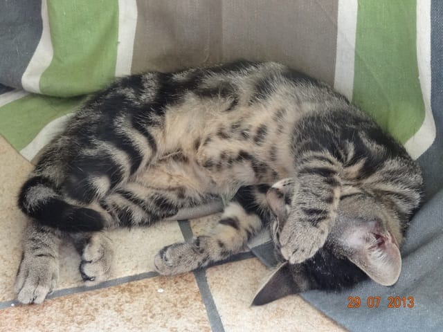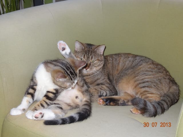 Des news. Twisty est de + en + sociable et câlin, et commence même à répondre à son nom. Etoile seconde super bien BB Harley pour s'occuper des bébés, elle joue beaucoup avec eux, et ils vont maintenant la voir autant que ma crapouille. Gatsby par contre n'est tjrs pas à prendre avec des pincettes... Il y a des moments où il va sentir un chaton sans rien dire, et 2 mn après on sait pas pourquoi il crache comme un cobra. Il crache aussi pas mal sur BB Harley :(