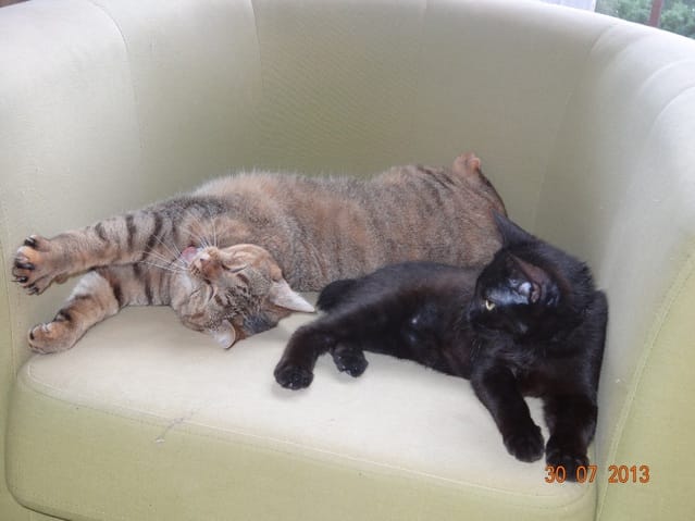 Alors voilà les news. Mes 3 loustics ont passé la soirée au fond de l'appart, Félia et Gatsby dans la chambre et BB Harley dans le bureau. Etoile n'a pas bougé de sous le meuble télé, et Nounouche était avec moi sur le canapé. Cette fifille est un amûûûûûûr de chattoune, petite glue de chez glue, toujours à rechercher les câlins et les bisous, à ronronner. Elle ne sera pas difficile à placer, du moins pour les gens qui aiment les chats sociables et très câlins.