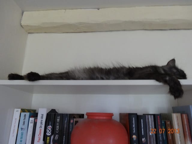 La bonne nouvelle c'est que je peux laisser la chambre ouverte, personne ne se réfugie sous le lit, ce que je craignais hier soir. Parce que non seulement il est assez bas, mais en plus il est particulièrement grand (160x200), donc si le chat ne sort pas tout seul il est irrécupérable de force.
