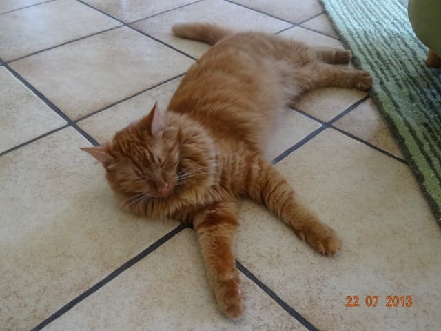 Ce matin Etoile était toujours à la même place sous le meuble TV. Je l'ai sortie pour la câliner et lui parler tout doucement, petit à petit elle s'est détendue, c'est mignon elle cache sa tête dans ma main quand le la câline :). J'ai cru que c'était gagné car après être descendue de mes genoux elle a commencé à marcher avec circonspection sur le tapis et à le flairer, mais d'un coup elle est repartie se cacher, cette fois sous un meuble de cuisine. ça ne va pas être simple pour lui mettre ses gouttes dans les oreilles !