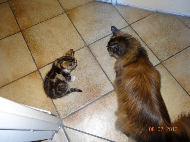Bon, le plus agressif envers les chatons c'est clairement Gatsby. Il crache vraiment fort, et quand je me suis levée ce matin il a même poursuivi le pauvre Tout Petit qui était dans la chambre, en feulant et en essayant de lui mettre une grosse tarte :(