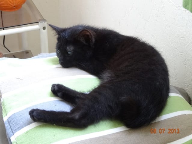 Alors voilà les news. Mes 3 loustics ont passé la soirée au fond de l'appart, Félia et Gatsby dans la chambre et BB Harley dans le bureau. Etoile n'a pas bougé de sous le meuble télé, et Nounouche était avec moi sur le canapé. Cette fifille est un amûûûûûûr de chattoune, petite glue de chez glue, toujours à rechercher les câlins et les bisous, à ronronner. Elle ne sera pas difficile à placer, du moins pour les gens qui aiment les chats sociables et très câlins.