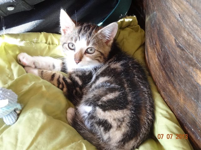 Ce matin Etoile était toujours à la même place sous le meuble TV. Je l'ai sortie pour la câliner et lui parler tout doucement, petit à petit elle s'est détendue, c'est mignon elle cache sa tête dans ma main quand le la câline :). J'ai cru que c'était gagné car après être descendue de mes genoux elle a commencé à marcher avec circonspection sur le tapis et à le flairer, mais d'un coup elle est repartie se cacher, cette fois sous un meuble de cuisine. ça ne va pas être simple pour lui mettre ses gouttes dans les oreilles !
