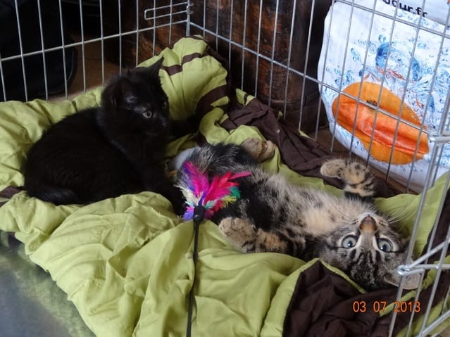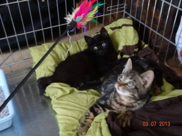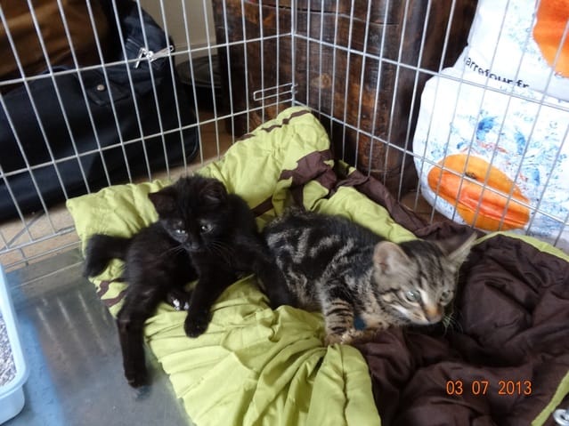 Mikado est plus calme, même s'il joue aussi il le fait plus en douceur. Il est confiant, se laisse attraper sans coucher les oreilles, a l'air d'apprécier les câlins, et au bout d'un moment s'endort sur les genoux contrairement à son frère qui cherche assez vite à s'échapper.