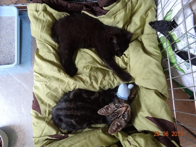Ils ont mangé leur pâtée, leur "maison" est toute propre (c'est pas croyable ce qu'un loupiot de cette taille peut faire comme pipis et crotouilles ! Et puis le bac à litière, quel merveilleux bac à sable ! Lol ), ils ont eu leur petit câlin, et je leur ai mis des jouets avec eux car ce matin Petit Tigré jouait avec leurs crottes, on fait plus hygiénique comme joujou ^^