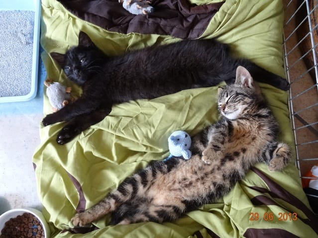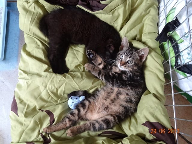 Ce qui est marrant c'est qu'hier Petit Noir crachouillait dès que j'approchais la main, et que maintenant c'est lui qui demande le plus de caresses et qui se met sur le dos pour avoir des gratouilles sur le bidou :)