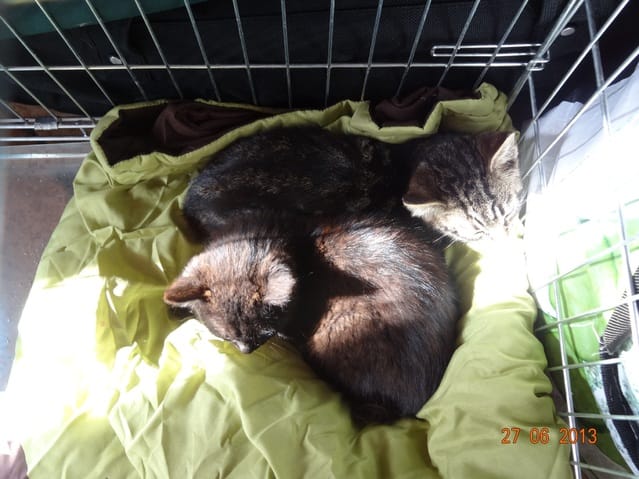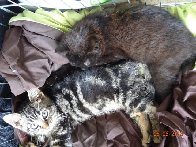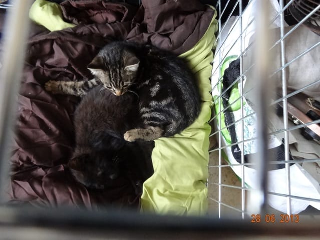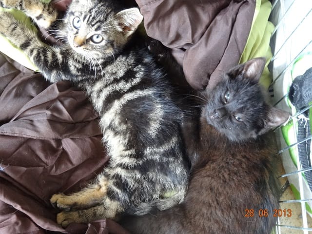 Ce sont deux petits mâles. Léo et moi ne sommes pas tt à fait d'accord sur l'âge, Léo leur donne entre 2 et 3 mois et moi à peine 2, de mémoire ils sont plus petits que BB Harley quand il est arrivé, mais en même temps je n'ai pas l'habitude de voir des chatons donc je peux me gourer. Quand ils seront un peu plus à l'aise je les pèserai, pour l'instant je ne les bouge que pour nettoyer la cage car bonjour la litière partout et les pataugeages dans la gamelle d'eau ! Lol