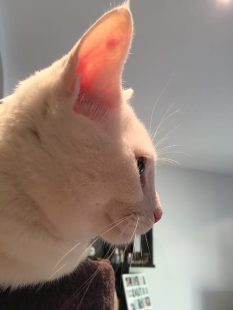 Je viens de m’apercevoir que mon chat tout blanc a la même tache a l’oreille que votre chat