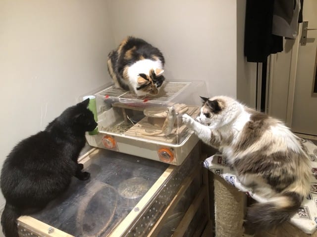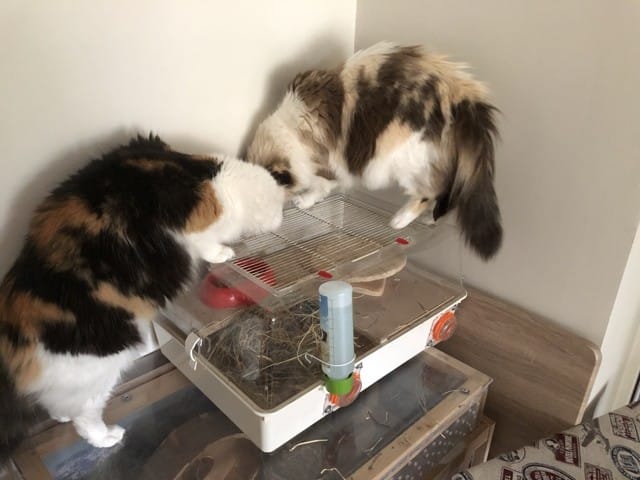 Pour les litières ce serait pas mal d'enlever les couvercles si elles en ont car la femelle se sentira plus à l'aide si elle peut voir le mâle s'approcher.