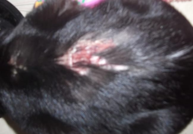 Voilà depuis samedi dernier mon chat à une drole de blessur. Ce jours j'ai entendu un chat hurler dans la rue, comme si c'était une bagarre elle est revenu chez moi tremper. Au début j'ai pensé que quelqu'un l'avait arrosé. Mais elle était bien trop paniqué et farouche pour que se soit juste ça et c'était impossible pour moi de m'approcher d'elle elle était devenu très agressif. Quand j'ai essayé de la prendre je me suis retrouver avec une pogné de poil dans la main alors qu'elle ne perd jamais c'es poil. Je les laisser ce calmé puis quand je les retrouver j'ai vu qu'elle n'arrêter pas de lécher son dos, la où elle était mouillé et puis j'ai vu une zone ou il n'y avait plus du tout de poil, le lendemain c'est devenuu rouge puis ca a viré un peu au jaune et bleu. Depuis, de jours en jours je vois cette blessurs ce repandre sur tout son dos. Je lui est appliqué les même soins que j'avais eu lorsque je m'était bruler au 3ème degré un jours sur toute ma jambe. Je sais alors à quoi ressemble une brulure, mais je ne comprend pas le fait que la surface de sa peau soit irrégulière. J'ai peur qu'elle ai été en contacte avec de l'acide ou un truc du genre, car la blessure se répand et progresse. Merci de m'aider, car je ne peu malheureusement pas l'emmener au vétérinaire elle est très farouche depuis.
