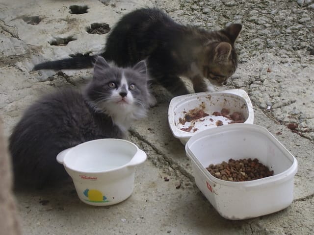 Ils ont chacun leur gamelle, dans une pièce différente. Je donne à l'aîné des croquettes pour chat stérilisé et pour le petit, des croquettes pour chaton.