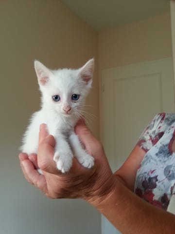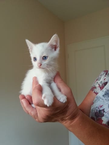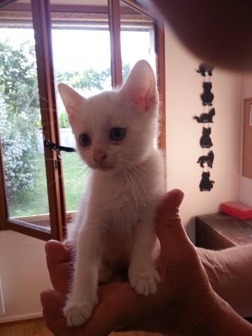 J'ai deux chats blancs : un mâle Gandalf et une femelle Leia. Gandalf est entièrement blanc aux yeux bleus et est sourd. Leia avait une tâche noire sur la tête quand elle était petite, tâche qui a aujourd'hui disparu (j'imagine que ne pas être totalement blanche lui a un peu fait éviter la tare génétique).