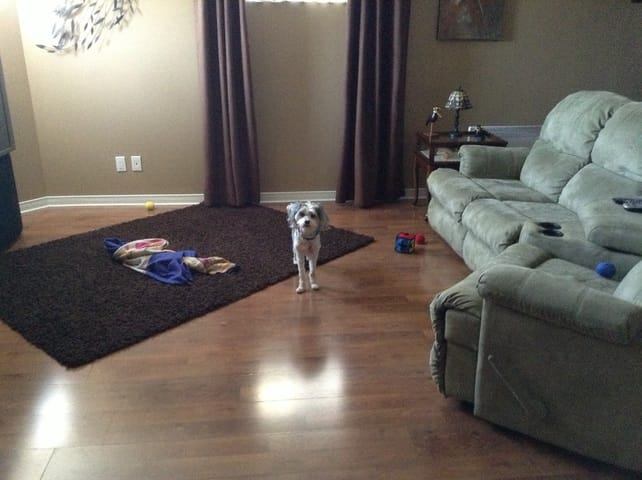Sa pièce fait 9m2, mon sous sol + sa pièce ça doit faire 27 m2. Ça me fait rire quand les gens imagine un sous sol comme un caveau au sol de béton, sans lumière et où on va une fois par an ^^ Je passe la plupart de mon temps dans mon sous sol, mes parents et Ollie aussi. Il est chauffé, éclairé, il y a une télé, des meubles, un divan, du parquet, un tapis ... une pièce normale quoi ...