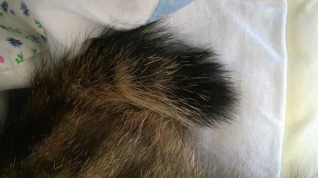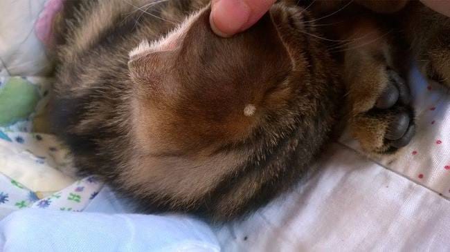 De plus, il a une petite touffe de poils blanche sur l’oreille (et je suis certaine que ce n'est pas son pelage !) vu qu'il y a une masse au centre de ces poils, ça me fait penser à une sorte de tique mais ... couverte de poils c'est chelou :