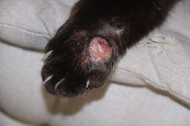 personnellement j'ai tout mis en oeuvre pour soigner mon chat, des paiements en plusieurs fois, des sacrifices autre. mais voir cette boule sur sa patte m'était intolérable, et elle est tellement soigneuse de ses poils, que cette boule devenait son obsession, elle l'a léchée sans cesse, et ça saignait. ne laissez pas votre chat comme ça. svp.