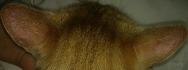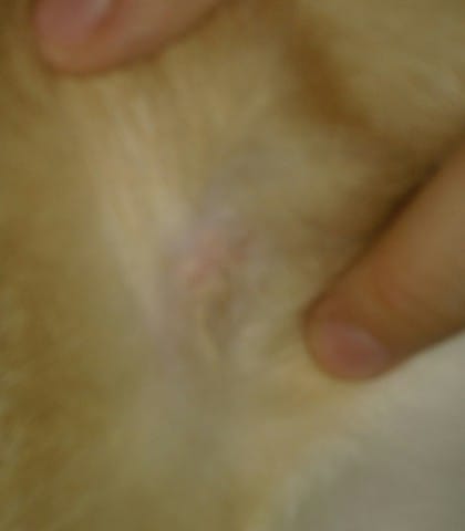 Bonsoir, alors voilà j'ai mon chat ( 1 an ) qui a depuis un certain moment que rougeur qui sont boursouflé à l'arrière de la cuisse. Quand j'ai remarquer ça je les amener au vétérinaire qui m'a donner le traitement antiparasitaire strongold et de la crème à lui mettre elle m'a dit qu'il devait sûrement faire une allergie mais ca ne passe pas pourtant je le traité, j'ai traiter ma femelle et le lapin avec qui il vie, la maison maintenant je vient de remarquer des petit boutons sur les oreilles. Il n'a pas d'accès à l'extérieur. Désoler pour la qualité de la photo auriez vous une petite idée de ce que sa pourrait être ?
