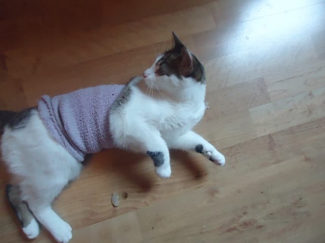 Jour 2 : L'alimentation revenait pour elles et elles étaient contentes, elles étaient bien éveillées et bien remise de l'opération de la veille, bien sur il faut veiller à ne pas prendre le chat sous le ventre pour éviter de lui faire mal. J'avais des anti infections à donner pendant 5 jours (ses médicaments ne sont pas toujours prescrit).