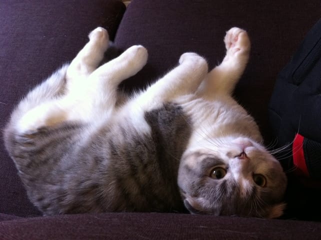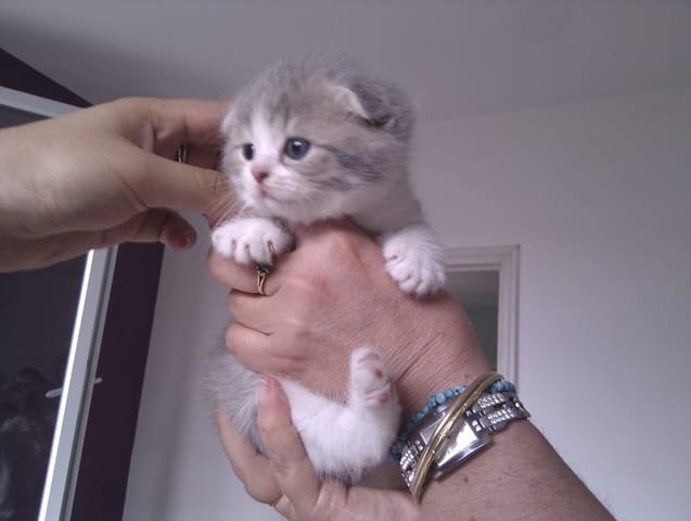 Mais finalement le chaton est parti avant. Je suis tombée sur une photo d'un scottish fold assis comme un humain, j'ai craqué et au final j'ai décidé d'adopter un scottish fold, que j'ai nommé Flagada Jones