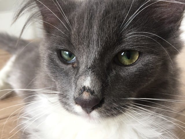 Ses yeux ont tendance à couler et à former des croutes et un des yeux à la paupière qui remonte.
