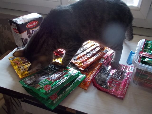 Bonjour, personnellement je ne donne que très rarement des friandises, quant j'en donne ce sont dans sans céréale acheté sur Zooplus et/ou des naturelle (viande séché) que vous trouverez également sur Zooplus.