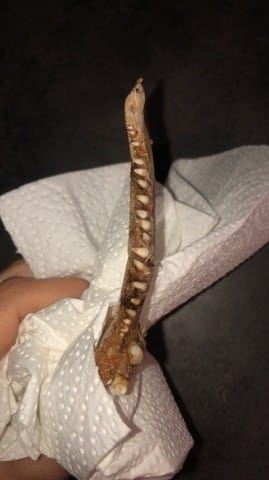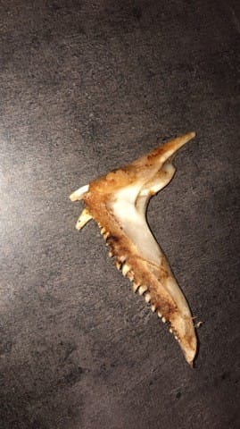 Elle se bat tres souvent avec d'autres chats et nous ramene souvent ses trouvailles (feuille, papiers, bouteille en plastique) mais aujourd'hui elle m'a ramené cela ! Je suis vraiment intrigué qui sait a quel animal sa pourrait appartenir ??