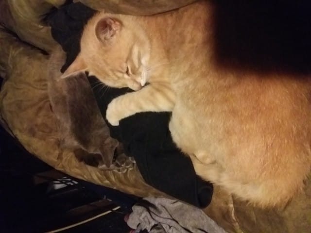 La maman est "tarie" dc c'est fini mais il a encore eu ya 5min un comportement etrange pour un petit d'un an et 3mois. Le 2ème chat au second plan en gris cartouche qui n'est pas farouche vient pour dormir et enjambe forest qui le chope sans bruit menace ni de l'un ni de l'autre.