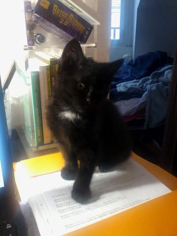 Voilà donc trois mois qu'ils habitent ensembles et début de semaine, je viens de récupérer un chaton. Il s’appelle Chopin, il a presque trois mois et aucun passif si ce n'est que celle qui devait le prendre en charge est morte. Il a emménagé sans "peur", il est directement parti en exploration partout dans l'appartement et a facilement prit ses marques.