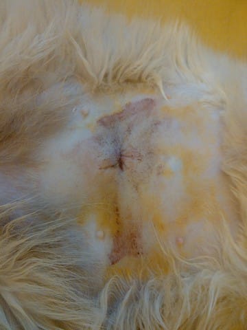 Bon j'ai regardé et comme m'avait dit le véto l'incision est minuscule et il n'y a pas de point de suture! Je vous mets la photo, âme sensible s'abstenir!