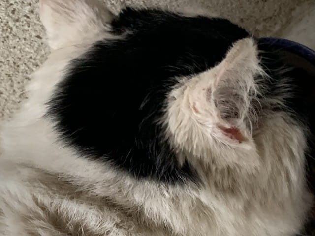 Par contre le jour où je l’ai revu, je ne le reconnaissais pas, il a œil assez rouge, gonflé, avec du pu qu’il nettoie en faisant sa toilette, de plus juste aussi de son œil il a une espèce de petite croûte étrange, j’ai préféré pas toucher pour ne pas le blesser. Et dernièrement, il a aussi quelque chose de bizarre derrière l’oreille mais je ne sais pas ce que je vous mets des photos pour m’aider !