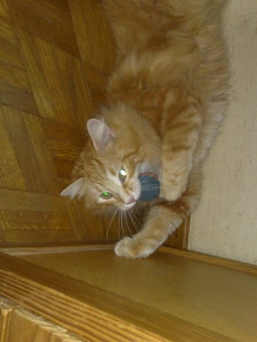 Mon chat joue de temps en temps à la baballe, je n'ai pas de photos, mais en ce moment, il fait la sieste, il a des petites balles en mousse, il s'assoie sur la balle puis il l'a fait sauter en l'air!!!!!!