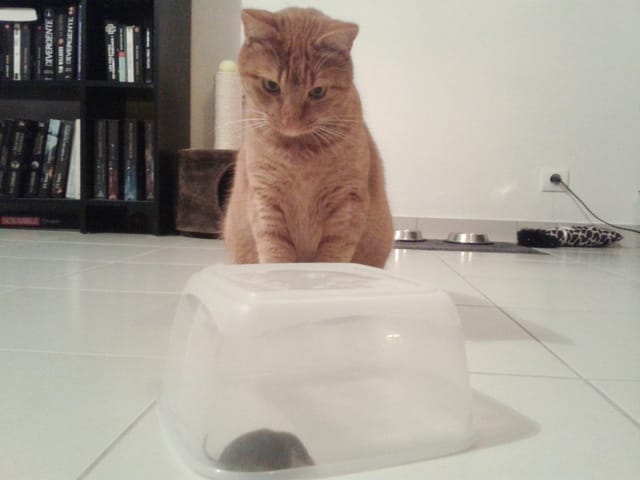 Depuis l'arrivée de Chataigne Dulcey nous montre plus que jamais ses talents de chasseur, ce soir une musaraigne bien vivante que j'ai eu du mal a capturer d'ailleurs!
