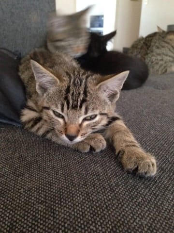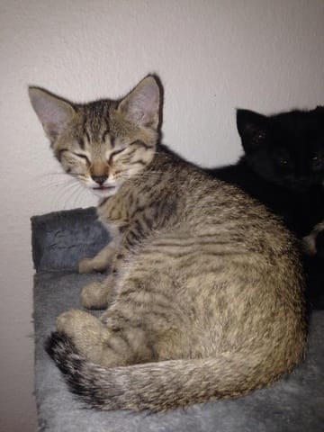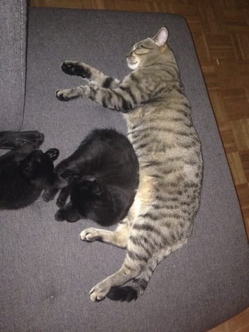 Sangha, le papa est castré depuis la veille de la naissances des petits. Mais il me semble plus gros. Je le vois souvent manger dans les gamelles des chatons au lieu de la sienne avec les croquettes adulte. Savanah, la maman en fait de même.